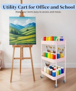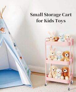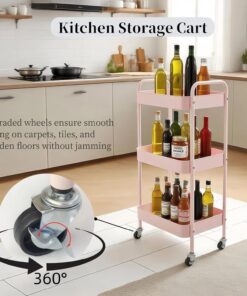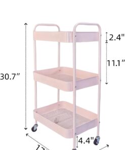 3 Tier Pink Rolling Cart for Nursery & Laundry Room with Handle & 4 Hooks, Metal Kitchen Storage Cart on Wheels and Lockable Casters, Large Capacity Sturdy Trolley for Lash Craft Bathroom