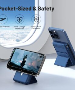 【Built-in TWO Cables & Foldable Stand】The portable travel charger for iphone has built-in USB C charging cables, perfectly compatible with iPhone or Type-C devices, no need to carry extra cables; The Magnetic Wireless Portable Charger Features a versatile built-in foldable kickstand can replace mobile phone stand that keeps your iPhone15/14/13/12 upright for a comfortable viewing angle.