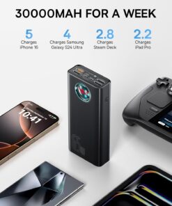 【Super Large Capacity】 30000mAh battery pack capacity provide 7 day of worry-free power to charges 6 times for iphone 15, samsung s20 ultra 4 times, ipad pro 2020 2.2 times, or provide a full charge to a 13 inch macbook pro. NOTE: It’s a must-have for outdoor activities, business trips and power outage emergencies, high capacity so the product is a little bulky.