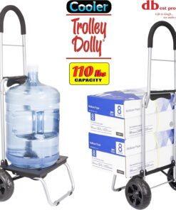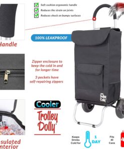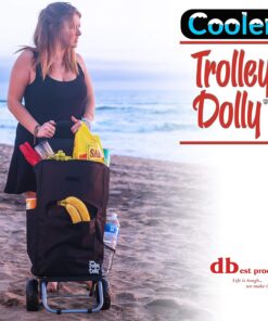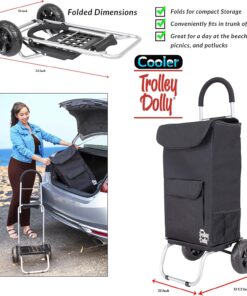 The cooler trolley Dolly is great to transport items around while on the go, downtown, or the business. It has a large comfortable cushion handle reducing the shock when it is being pulled. The oversize beefy wheels allow for smooth rolling on any surface, even uneven paths. It has a removable shopping bag which features seven compartments and pockets including beverage holder. Remove the shopping bag and the trolley transforms into a Dolly for amazing weight capacity of 110 pounds. It is the ideal solution to move a wide variety of items with ease. The trolley Dolly folds in half the size of traditional trolleys for compact storage anywhere when not in use.