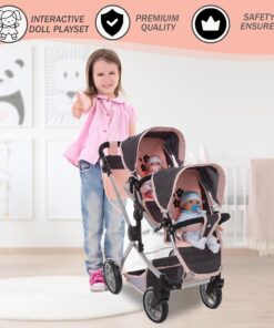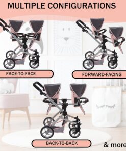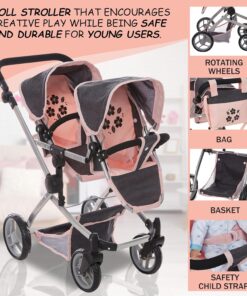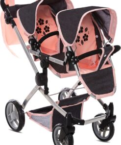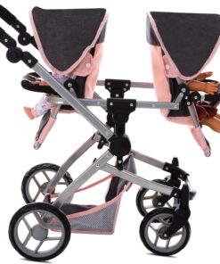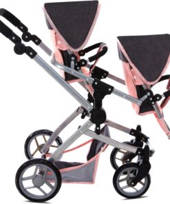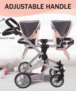 Convertible Baby Doll Double Stroller: Designed for double the fun; perfect for twins or 2 stuffed toys; offering twin pram multiple configurations; face to face forward facing; or back to back; adjustable handle up to 27.5″ ; fits 12 to 18″ dolls ensures funplay for kids