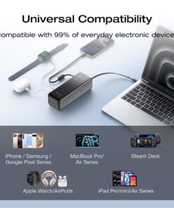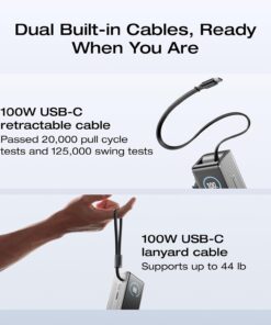 100W Built-in Lanyard and Retractable Cables: No more lost cables—the 100W built-in USB-C retractable and lanyard cables are there when needed and integrated neatly into the power bank’s sleek design, with a retractable mechanism that lets you access power in seconds.
