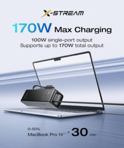 170W Fast Charging: Multi-port output of up to 170W, supports charging up to four devices simultaneously. 100W max for single-port charging. 1 × USB-C port, 1 × 26 in retractable USB-C cable, 1 × 10 in lanyard USB-C cable, 1 × USB-A port.
