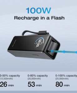 100W Max Input Power: RAPID power bank recharges up to 50% in just 26 minutes, perfect for two full phone charges or a quick laptop top-up to last the day.