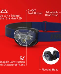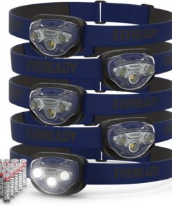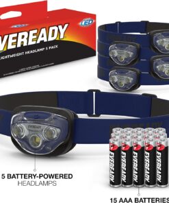 Keep your hands free with these Eveready LED Headlamp. This innovative indoor and outdoor light lets you use your hands while you work, making it a great lighting solution for work or outdoor adventures. Up to 4 times brighter than standard LED technology, this LED headlamp casts a 165-foot beam that lets you see far ahead. Powerful white LEDs provide excellent all-around coverage to work by, and modes for High and Low let you adjust the light intensity of the work headlamp to suit your task. A convenient push-button lets you toggle between modes. The ultralight headlamp has adjustable straps for comfortable wear, and the pivoting head lets you direct the beam to wherever you need bright, white light. A shatterproof lens, IPX4 water-resistance and impact-resistance ensure dependable use on work sites and outdoors. Always Trusted. Always Ready. EVEREADY. [GREAT WORK HEADLAMP]: This 5-pack of Eveready LED Headlamps with 15 Eveready AAA batteries provides hands free lighting[CONVENIENT]: Innovative hands free outdoor light for home projects and work conditions[VERSATILE]: Works great as a bike headlamp, fishing headlamp and camp headlamp[LONG RUNTIMES]: Small headlamp casts 200 Lumens for up to 7 hours[DURABLE LED HEADLAMP]: IPX4 water-resistant and impact-resistant up to 3 feet