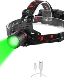LED headlamp with powerful LED green light for night vision. Max brightness up to 1000 lumens. Perfect head light green for coon, hogs, predators, coyote, varmint hunting, hiking, camping, photography, aviation, fishing, night observation and detecting, military bunkers.