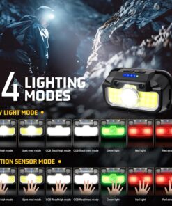 【14 Lighting Modes】This headlamp with red and green light boasts 14 different lighting modes to meet all your needs. ①In key light mode, you can easily switch between spot high mode (up to 3.5 hours), spot med mode (up to 8 hours), COB flood high mode (up to 5.5 hours), COB flood med mode (up to 8 hours), green headlamp (up to 5 hours), red light headlamp (up to 3.5 hours), and red strobe (up to 6.5 hours). ②In motion sensor mode, it provides the same 7 lighting modes for your convenience.
