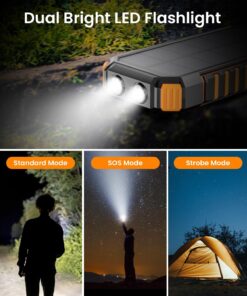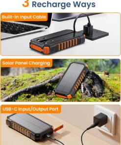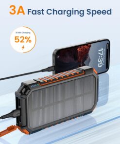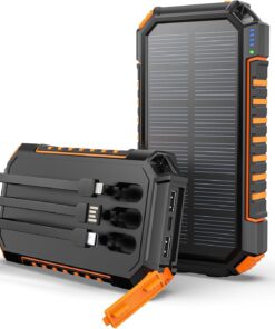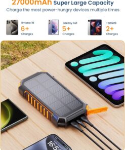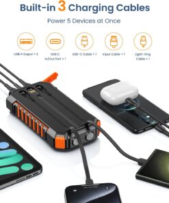 [Streamlined Charging Solution] The solar power bank boasts 2 built-in output cables (Type Cx1 & iPhonex1) alongside a USB-A input cable, doing away with the hassle of extra charging cord. No more tangled wires – charge up easily anytime, anywhere.[Charge Up to 5 Devices Together] In addition to the two built-in cables, the solar charger also boasts 2 USB-A outputs and 1 USB-C input/output. This allows for the simultaneous charging of up to 5 devices, making it ideal for sharing with family and friends.[Lightning-Fast 3A Charging] Enjoy charging speeds up to 2.5X faster than standard chargers with our 5V/3A solar phone charger. Charge an iPhone 15 from 0 to 55% in just 30 minutes. Plus, it fully recharges in 7-8 hours with a quick charge adapter, ensuring you stay powered up.[Impressive Capacity] Boasting a massive 27000mAh premium Li-polymer battery, the portable charger can charge your devices multiple times over. It can be recharged via adapter or solar power, free your worries of power outage. With a smart protection IC chip, it guarantees safe charging every time.[Rugged Design for Outdoor Adventures] Built to withstand the toughest outdoor conditions, our solar battery pack is Waterproof, Shockproof, and Dust-proof. Equipped with dual super bright LED lights, it’s a must-have for outdoor activities and home emergencies.