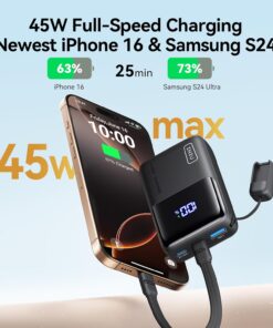45W Full-Speed Charging Newest iPhone 16 & Samsung S24 : With a maximum output of 45W, it supports PD, QC, and Samsung Super Fast Charging. Enjoy full-speed charging without compromising convenience or speed, whether it’s the latest iPhone 16 or Samsung S24.