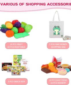 【Super Value Grocery Set】Including a toddler shopping cart, 15 fruit, 18 vegetables, 14 fast food, 10 dessert, 6 snack box, 7 fake money and a shopping bag. A value pack of play supermarket toys set for toddlers 3+.