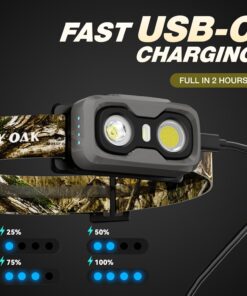 Rechargeable & Waterproof: IPX4 rainproof, Type-C rechargeable, fully charged in 2 hours. Four LED indicators display battery level and charging status, while the head lamp automatically locks out the light during charging to prevent accidental operation