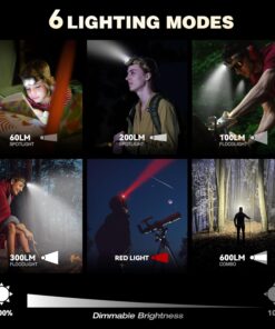 6 Lighting Modes: – Constant red light to preserve night vision- 60LM spotlight for reading or indoor tasks- 200LM spotlight for trail running or hiking on forest paths- 100LM floodlight for campsite or fishing, 300LM floodlight for repairs or inspections- 600LM max mode to light up long distances or find your way off-trail