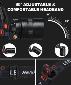 90° ADJUSTABLE & COMFORTABLE HEADBAND: Headlamps for adults rechargeable is designed with a 90°angle adjustable, ensuring that you can choose the optimal lighting angle for different needs. Each degree is very solid, avoiding shaking and sliding when using. At the same time, we are equipped with a comfortable and adjustable high elasticity headband, which is very light and will not put pressure on your head, ensuring comfort during extended use