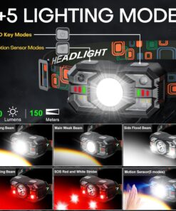 Waterproof and 10 Lighting Modes: This head lamp has IPX6 waterproof rate, with a tightly sealed premium casing that shields against rain and snow from all angles, making it suitable for both indoor and outdoor adventures. LED headlights have 10 lighting modes to meet your various needs. In key light mode, you can switch the main strong beam, main weak beam, side flood beam, red warning beam, SOS red and white strobe. In sensor mode, you can also switch between the above 5 lighting modes