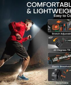 60° Adjustable and Comfortable Headband: Our head lights for forehead features a versatile 60° adjustable beam, enabling you to tailor the angle of illumination for optimal lighting in any direction. Whether you’re scaling rocky terrain, navigating dark trails, or working in tight spaces, precise light control is at your fingertips. Coupled with a soft, adjustable, breathable and sweat-wicking headband, the head lamps led rechargeable ensures maximum comfort during extended wear