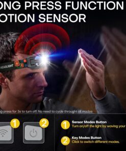 Long Press Function and Motion Sensor: This Sogdeco headlamp features a convenient long-press function for easy power on/off in any mode. In any mode, simply hold the key mode button for 3 seconds to instantly turn off the light, regardless of the current mode, eliminating the need to cycle through all settings. It also added motion sensor mode, you can effortlessly turn the light on/off with a wave of your hand, ensuring hassle-free operation even when hands are dirty