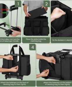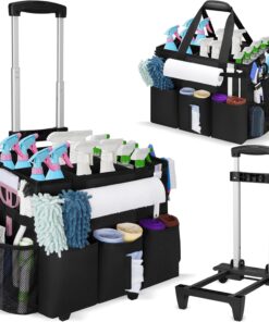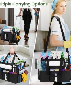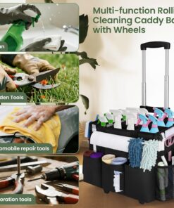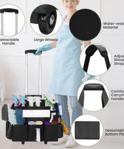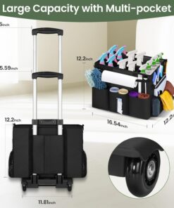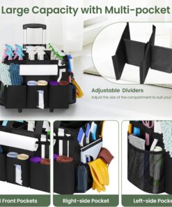 Rolling Cleaning Caddy with Wheels, Large Cleaning Supply Organizer Bag with Detachable Trolley & Shoulder Strap, Water-Resistant Cleaning Cart Bag with Removable Dividers for Housekeeping, Cleaner