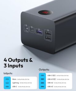 Multiple Charging Options: Equipped with 4 outputs and 3 inputs, charge multiple devices simultaneously with two 5V/2.4A USB ports, one Type-C port, and one USB fast charging port. Recharge the battery pack via Micro USB, Lightning, or USB Type-