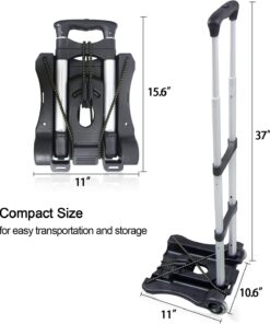 Hand Truck Size: Max 37.4″ × 10.6″ × 11″, Folding Size: 3.3″ × 10.6″ × 15.6″, Folds flat for easy transportation and storage.