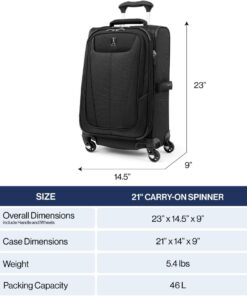 LIGHTWEIGHT: A half pound lighter than Maxlite 4, this spinner meets most international carry-on size limits. Case Dimensions: 21″ x 14″ x 9″ | Overall Dimensions (includes wheels and handles): 23 x 14.5″ x 9″ | Weight: 5.4 lbs | Volume: 46 L.